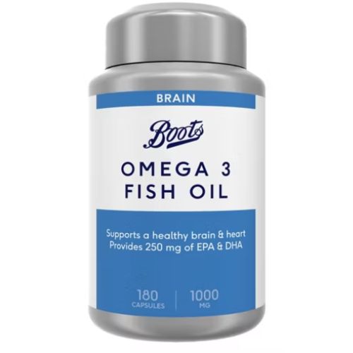 Boots Omega 3 Fish Oil 1000 mg 180 Capsules is a dietary supplement that contains Omega-3 fatty acids, specifically EPA (eicosapentaenoic acid) and DHA (docosahexaenoic acid). These essential fatty acids are known for their numerous health benefits, including supporting heart health, brain function, and overall wellbeing. Each capsule typically provides around 180 mg of EPA and 120 mg of DHA, which are important nutrients that many people may not get enough of in their regular diet.