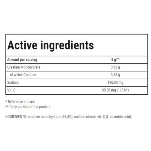 INGREDIENTS: creatine monohydrate (76,4%); sodium citrate; vit. C (L-ascorbic acid).