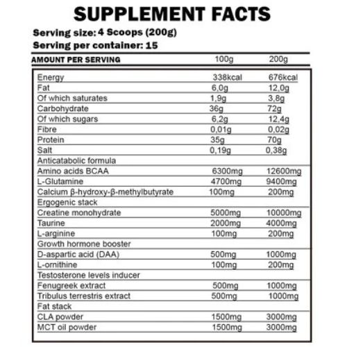 Ingredients: protein complex [whey protein isolate (from milk), whey protein concentrate (from milk), hydrolysed whey protein concentrate (from milk)], carbohydrate complex (maltodextrin, glucose), creatine monohydrate, CLA powder, MCT oil powder, L-glutamine, cocoa5, taurine, cocoa13,14, instant coffee15, D-aspartic acid (DAA), fenugreek extract (Trigonella foenum-graecum L.), Tribulus Terrestris extract (Tribulus Terrestris L.), calcium β -hydroxy- β -methyl butyrate (Ca HMB), L-arginine, L-ornithine, thickener (xanthan gum), red beet juice concentrate2,3,4, flavourings1,2,3,4,5,6,7,8,9,10,11,12,13,15, flavouring14,16, colour/s (E1634, E160a6,8,9, E150c7,8,12).
