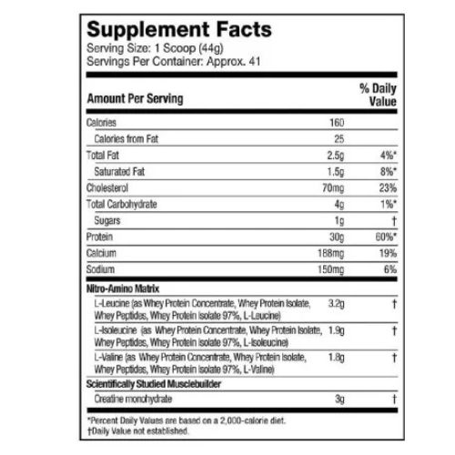 MuscleTech Nitro-Tech Whey Protein 4 lbs is an award-winning whey protein powder that uses ultra-pure whey protein isolate and whey peptides to help you build muscle fast. This delicious, easy-mixing powder also provides 2 grams of sugar, 3 grams of creatine, 6.8 grams of BCAAs, and 5 grams of glutamine to help support muscle growth and recovery. And 3.3 grams of leucine helps promote muscle protein synthesis for even more gains.