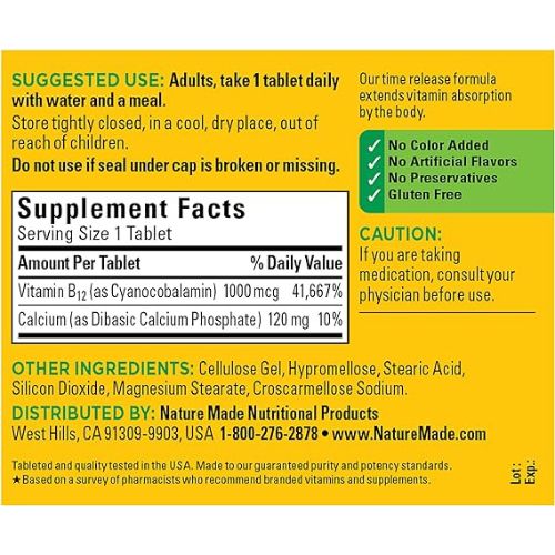 - Vegetarian-friendly formula: Nature Made Vitamin B12 1000 mcg Tablets are suitable for vegetarians, making them an excellent choice for individuals following a plant-based lifestyle or those who have dietary restrictions. These tablets offer a convenient way to meet your daily vitamin B12 needs without compromising your dietary preferences.