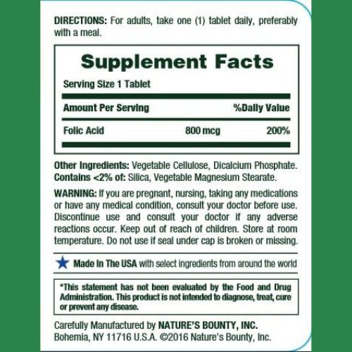 - Supports Cardiovascular Health: Folic Acid is known to help maintain healthy levels of homocysteine, an amino acid linked to heart health. By incorporating Nature’s Bounty Folic Acid 800 mcg tablets into your daily routine, you can support your cardiovascular system and reduce the risk of heart-related issues.