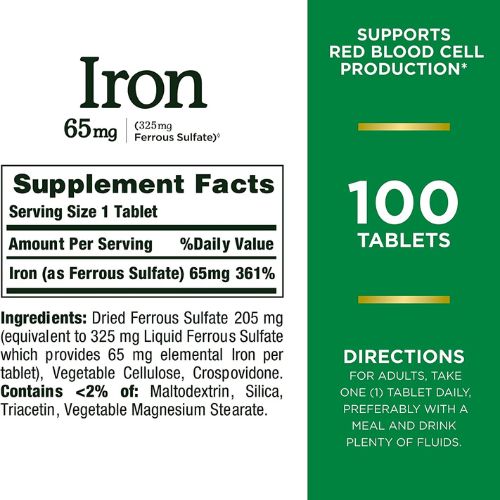 Nature’s Bounty Iron 65mg, 325 mg Ferrous Sulfate, Cellular Energy Support, Promotes Normal Red Blood Cell Production, 100 Tablets
