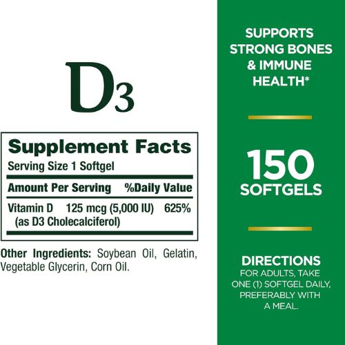 • Bone Health: Nature’s Bounty Vitamin D3 5000 iu of Vitamin D3 per capsule, Nature’s Bounty Vitamin D3 helps support bone health by aiding in calcium absorption. This is especially important for individuals at risk of osteoporosis or those who have limited dairy intake.
