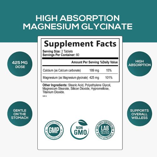 - Promotes Overall Wellbeing: Nature’s Nutrition Magnesium Glycinate 425 mg tablets are formulated to support overall health and well-being. With this high-potency formula, you can enjoy the benefits of magnesium for a healthy and balanced lifestyle.