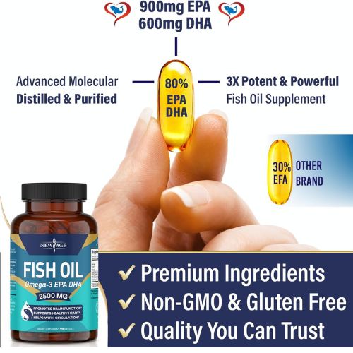 • Heart Health Support: New Age Fish Oil 2500 mg is rich in omega-3 fatty acids, which have been shown to support cardiovascular health by helping to lower triglyceride levels and reduce the risk of heart disease. With a high concentration of EPA and DHA, this fish oil supplement promotes healthy circulation and overall heart function.