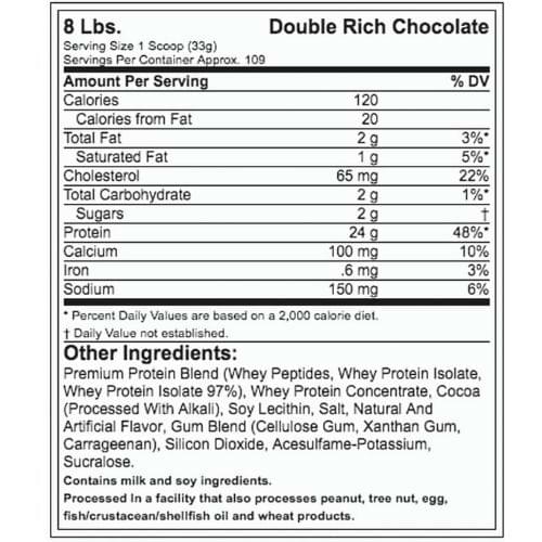 Isolate protein & peptide blend (whey peptides, whey protein isolate, whey protein isolate 97%), whey protein concentrate, cocoa (processed with alkali), soy or sunflower lecithin, salt, natural and artificial flavors, gum blend (cellulose gum, xanthan gum, carrageenan), silicon dioxide, acesulfame-potassium, sucralose.