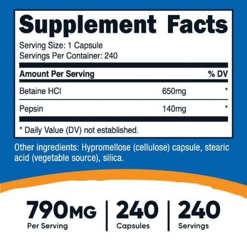 - Supports Healthy Digestion: Nutricost Betaine HCl Pepsin capsules are designed to enhance your digestive process. By increasing stomach acidity, they help break down food more effectively, promoting better nutrient absorption.