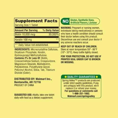 Spring Valley Biotin 10000 mcg Tablets support healthy energy production and immune function while helping to maintain healthy hair, skin, and nails. With 10,000 mcg of biotin per tablet, these tablets are an excellent way to help supplement your daily needs for this important nutrient.