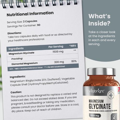 - Improved Stress Management: VitaBright Magnesium Glycinate 1500mg 180 capsules of VitaBright Magnesium Glycinate 1500mg, you can experience reduced feelings of stress and anxiety by promoting relaxation and supporting a calm mind throughout the day.