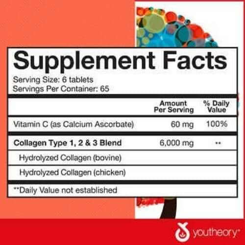Powerful Ingredient Combination: Youtheory Collagen tablets are formulated with 2 key ingredientsâcollagen peptides and Vitamin Câplus biotin for added benefits. The hydrolyzed collagen works to replace depleted collagen levels in the body, while Vitamin C helps promote optimal absorption of the collagen for maximum efficacy.